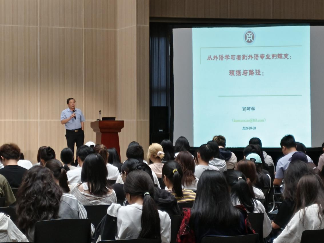 接着,肖坤学教授以“从外语学习者到外语专业的蝶变:理据与路径”为主题,运用其深厚的学术底蕴和独到的见解,给同学们带来了第1期学术讲座。肖教授首先强调了外语在我国对外开放进一步深化、“一带一路”建设稳步推进时代背景下的重要性与不可替代的价值。他指出,语言是文化的重要载体,是文化交流和文明互鉴的桥梁。外语不仅具有工具性,同时具有专业性、学科性和人文性。同时,他坦言当前外语专业学生中普遍存在的问题,如缺乏对专业的正确认识、学科意识与创新意识不强、实践能力发展不充分等,引人深思。随后,肖教授从多维视角出发,阐述了外语专业的内涵、外语专业人才应具备的素养与能力,鼓励同学们不仅要精通语言,更要拥有跨文化交流的能力、批判性思维和创新能力,成为新时代复合型外语专业人才。
