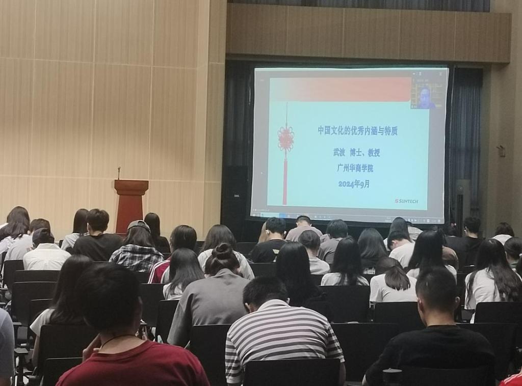 接下来,“善学”讲坛第2期开讲,外交学院武波教授为同学们带来关于“中国文化的优秀内涵与特质”的主题讲座。武教授阐述了中国人独特的世界观与哲学观,深入浅出地剖析了中华文化的深厚底蕴和哲学智慧。他指出,中国人的世界观和哲学观是历经千年积淀而形成的,具有鲜明的民族特色和深刻的哲理内涵。他强调,“和”指的是和平共处,体现了中国人追求和谐、避免冲突的智慧;“合”则指分工合作,凸显了中国人团结协作、共同发展的精神,还着重讲解了礼教在中国文化可持续发展中的根本保证作用。在讲座中,武教授引经据典,旁征博引,用生动的案例和深入浅出的语言,为同学们呈现了一场文化盛宴。