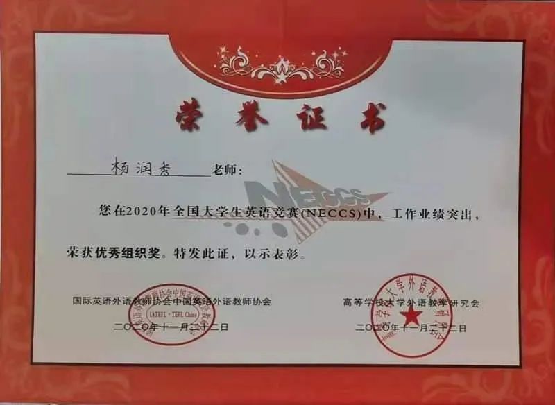 pp电子副院长杨润秀教授在高等学校大学外语教学研究会主办的2020年全国大学生英语竞赛中(NECCS)中,工作业绩突出,荣获优秀组织奖,特此祝贺!