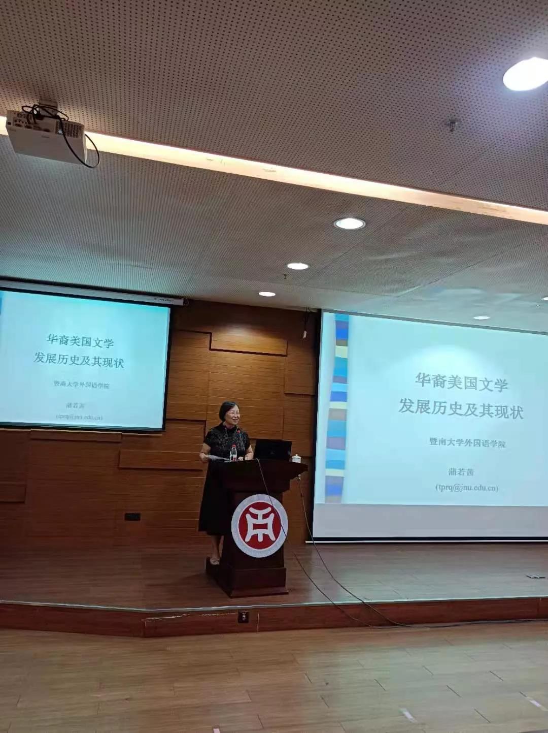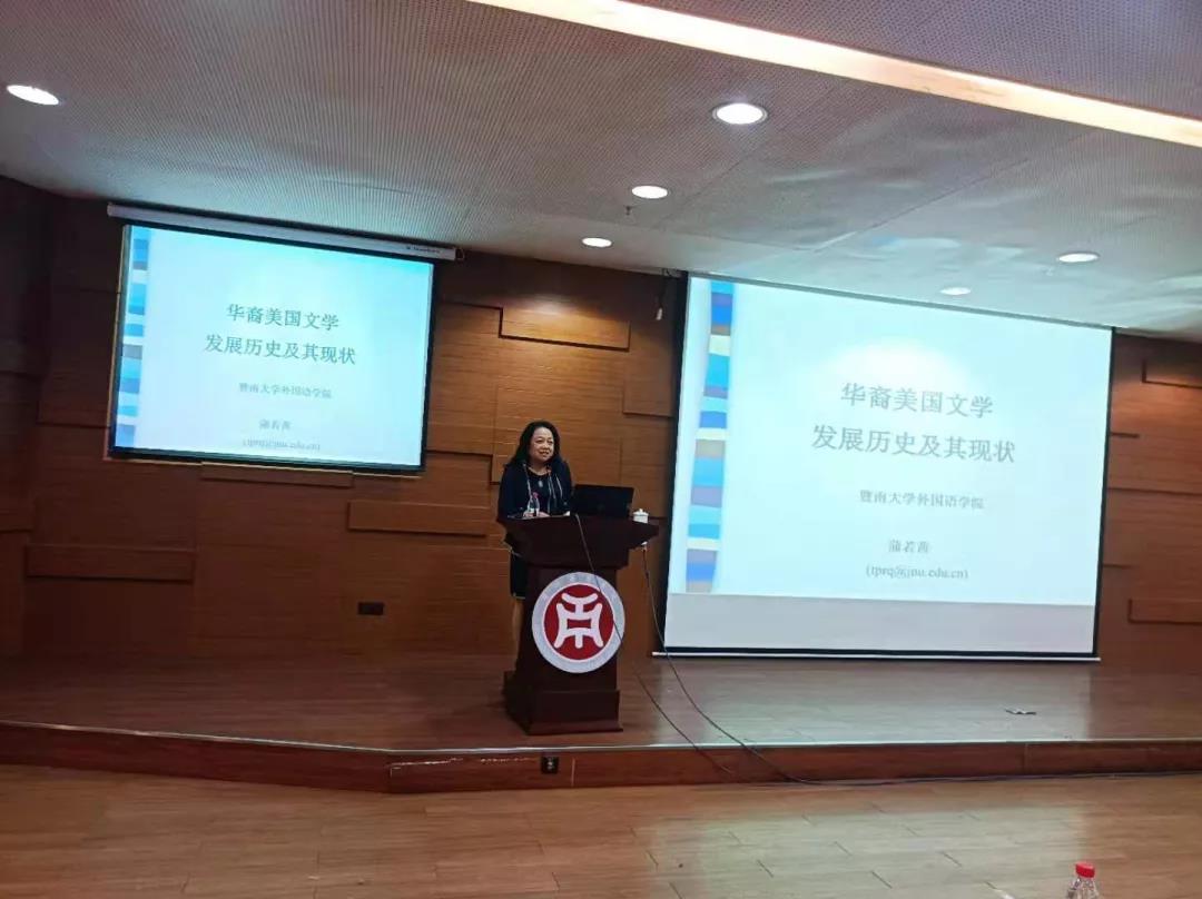 10月14日,暨南大学pp电子官方网站入口比较文学与世界文学专业博士研究生导师蒲若茜教授在图书馆一楼学术报告厅为pp电子师生举办了一场题为“华裔美国文学的发展历史与现状”的讲座。讲座由pp电子副院长张丽教授主持。