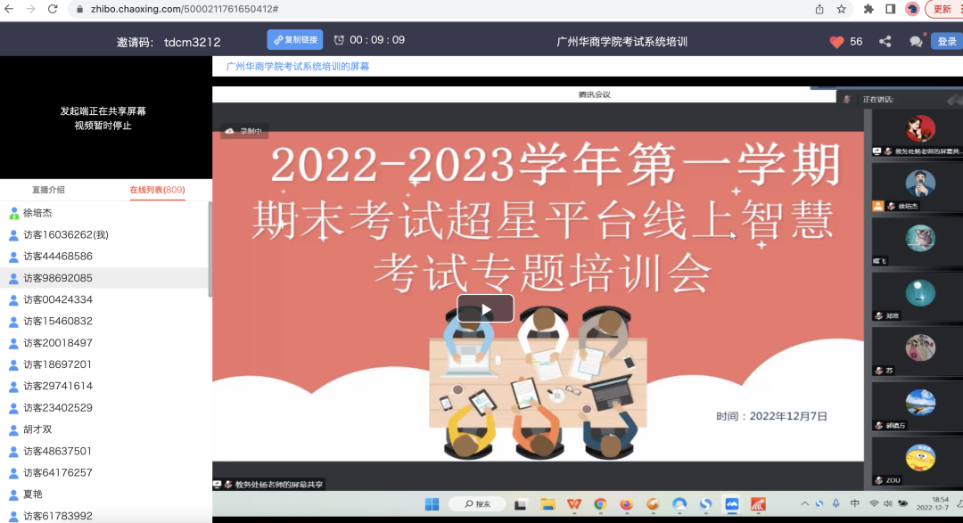 为帮助教师熟练使用华商学院网络教学平台(学习通)在线考试模块的相关功能,2022年12月7日晚,教务处邀请超星集团讲师,通过腾讯会议和超星直播平台,为pp电子两校区近1400名任课教师、行政教辅、辅导员等开展学习通线上考试系统培训,教务处考务科杨老师主持线上培训会。