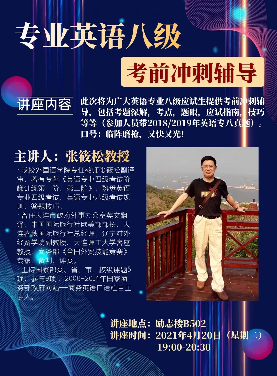 此次将为广大英语专业八级应试生提供考前冲刺辅导,包括考题深解,考点,题眼,应试指南,技巧等等(参加人员带2018/2019年英语专八真题)。