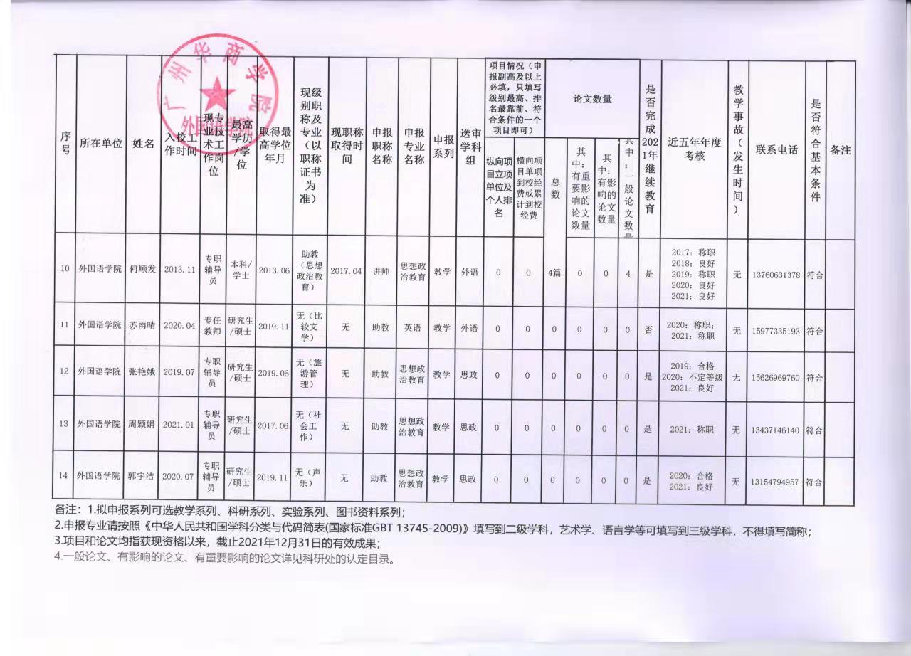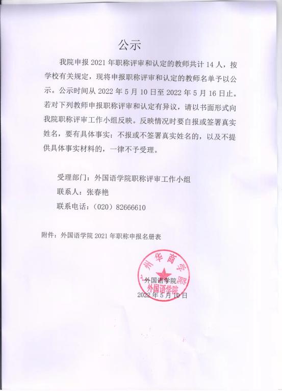 pp电子申报2021年职称评审和认定的教师共计14人,按学校有关规定,现将申报职称评审和认定的教师名单予以公示。公示时间从2022年5月10日至2022年5月16日止。若对下列教师申报职称评审和认定有异议,请以书面形式向pp电子职称评审工作小组反映。反映情况时要自报或签署真实姓名,要有具体事实;不报或不签署真实姓名的,以及不提供具体事实材料的,一律不予受理。