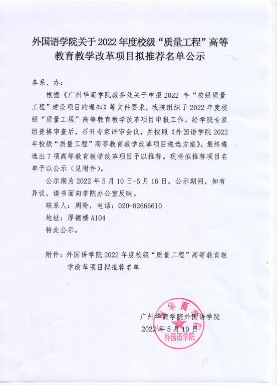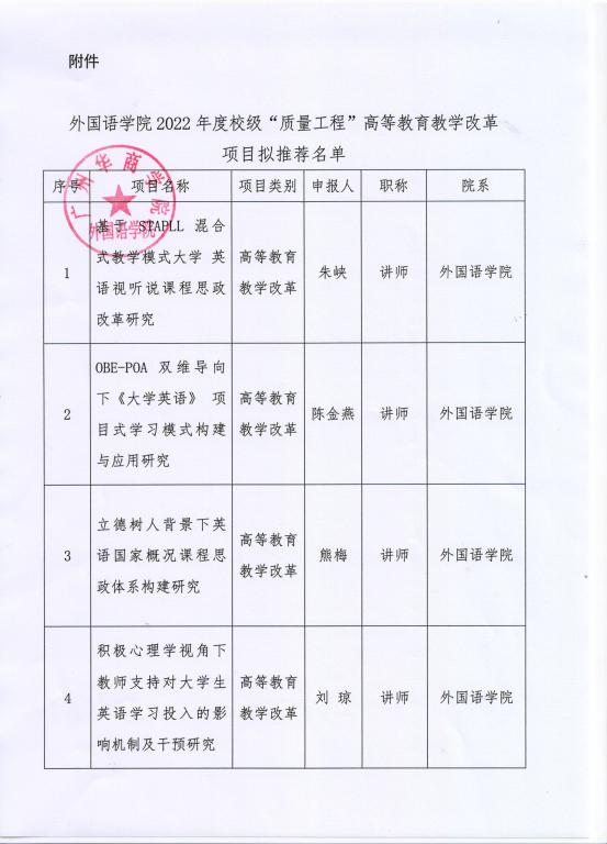 附件:外国语学院2022年度校级“质量工程”高等教育教学改革项目拟推荐名单