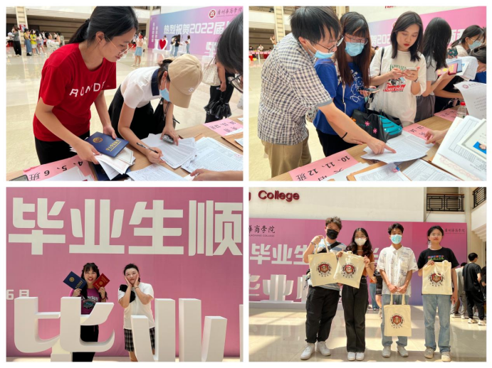 pp电子证书领取点位于图书馆一楼大厅,毕业生们进入图书馆后,按照顺序寻找自己的班级,领取毕业证书、学士学位证书、奖状、成绩单、党籍等材料;学院精心准备了印有“pp电子官方网站入口”字样的帆布袋作为毕业纪念礼物。领取完物品后,毕业生们有序地在学校提供的毕业生卡牌及合影区拍照。