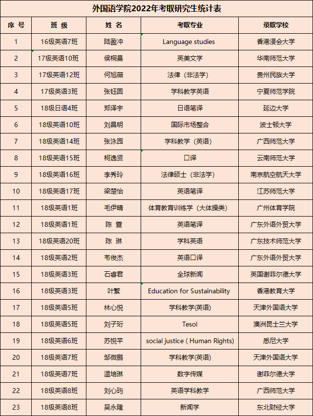 pp电子重视学生素质教育,2022年考取研究生共23人,2021年在专业技能比赛中学生获得省级以上奖励共122项,如广东省第八届“联盟杯”本科高校英语写作大赛特等奖、首届CATIC杯全国传译大赛一等奖等,获得喜人成绩,工作成果显著。