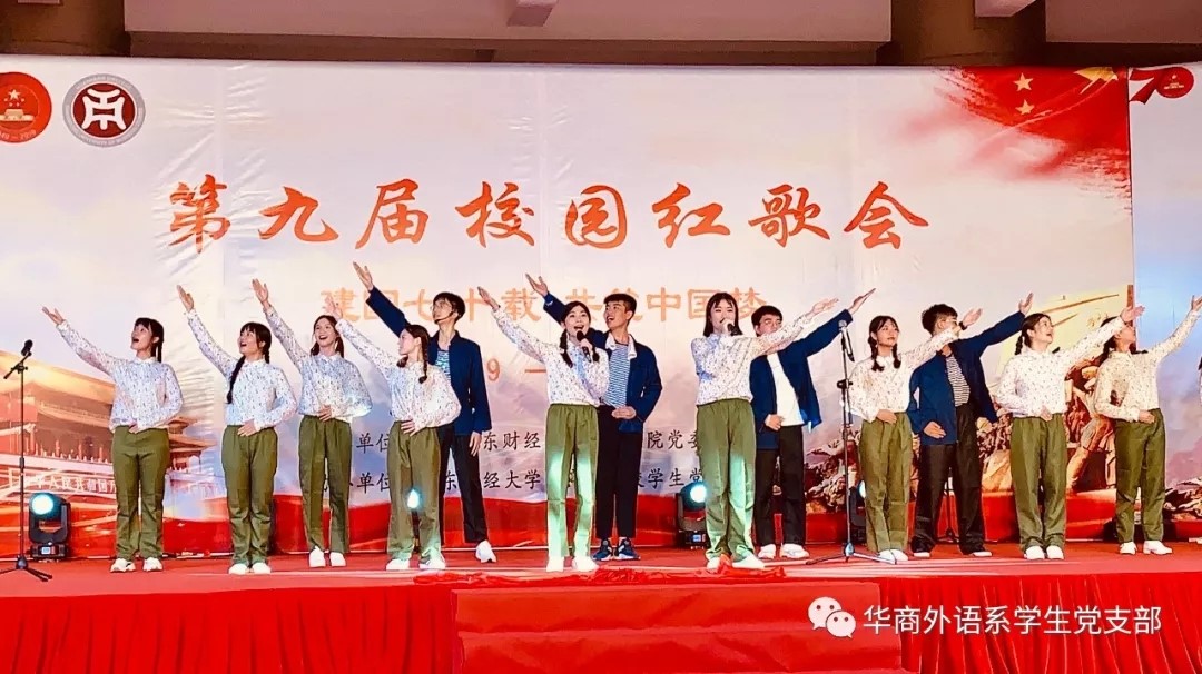 为唤起红色的记忆,唱响红色的情怀,广东财经大学华商学院各院系于2019年6月21日晚上,在学校启智楼一楼举办第九届校园红歌会,外语系学生党支部代表队参加此次活动。