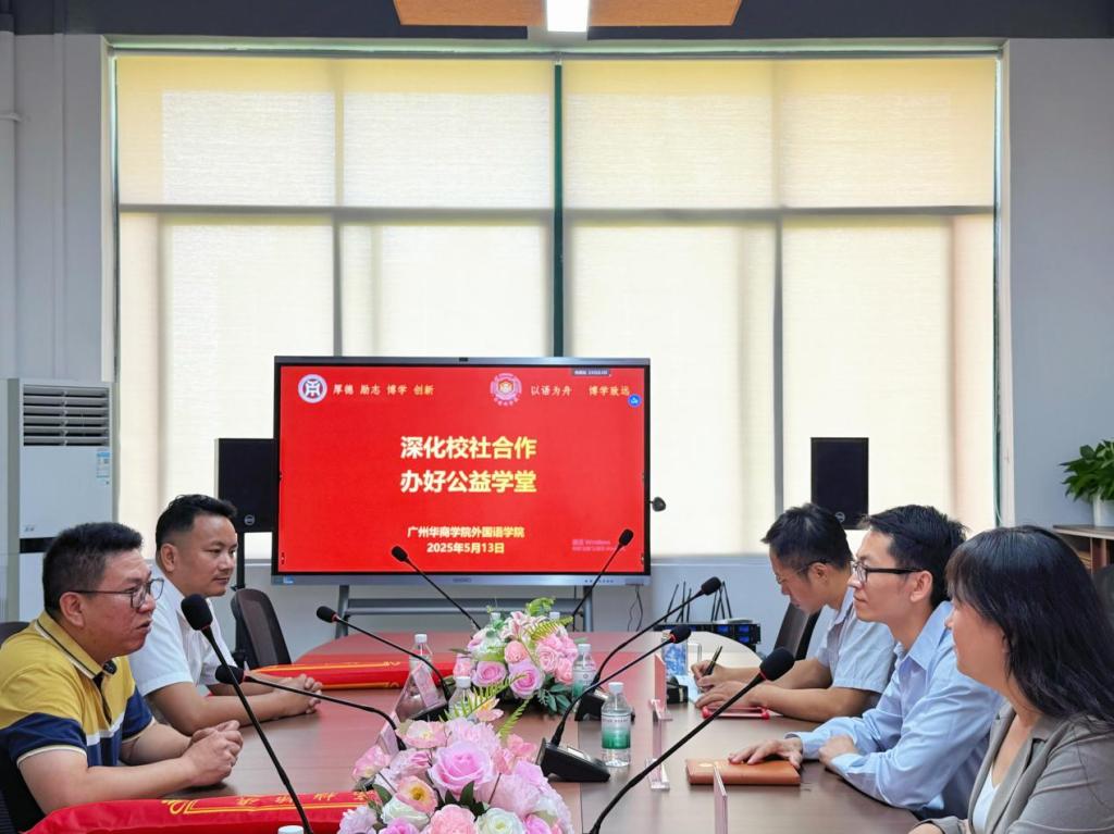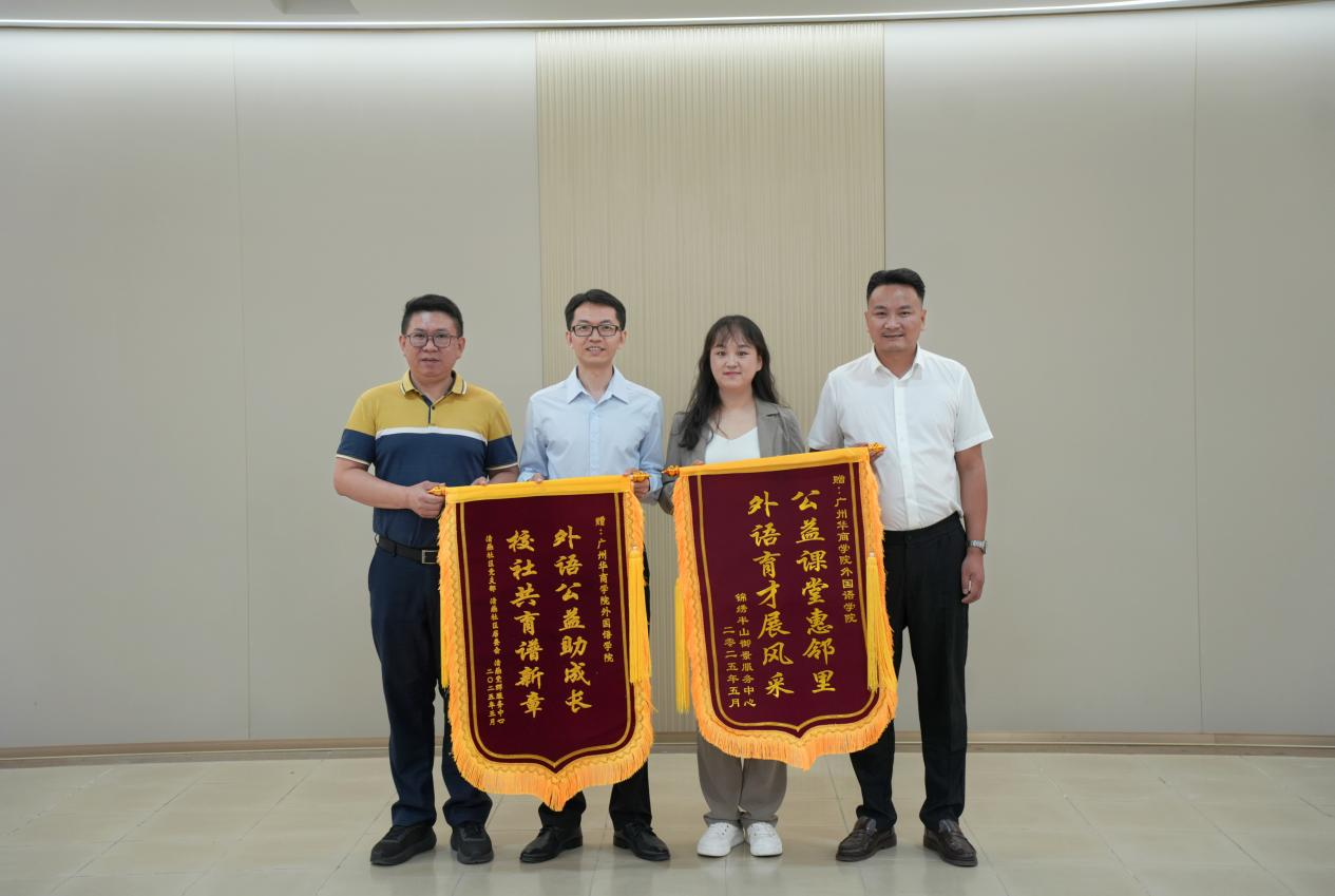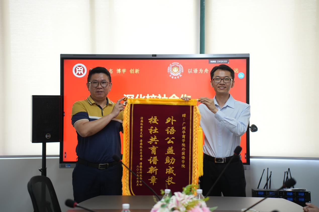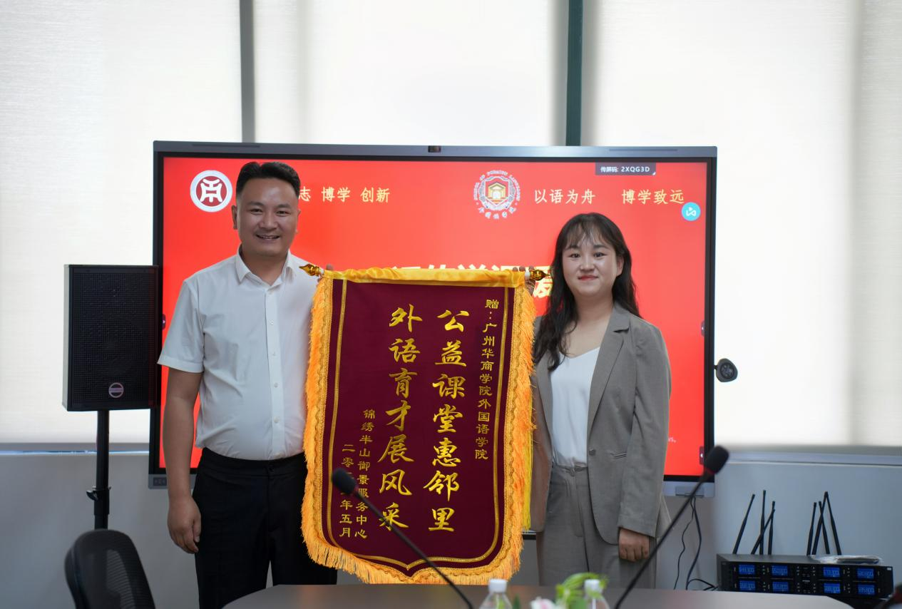 5月13日上午,pp电子官方网站入口与增城区清燕社区、锦绣半山御景花园小区物业联合举办的“晚风学堂”英语晚辅公益项目赠锦旗仪式在创新楼403-2小会议室举行。清燕社区邓镜波书记、锦绣半山御景花园小区物业陈勇经理、pp电子官方网站入口何顺发副院长及“晚风学堂”项目组全体成员共同见证这一校社协同育人的温暖时刻。“晚风学堂”不仅体现了外院学子践行社会责任的热忱,更是校社双向奔赴、共筑教育公益新模式的生动缩影。