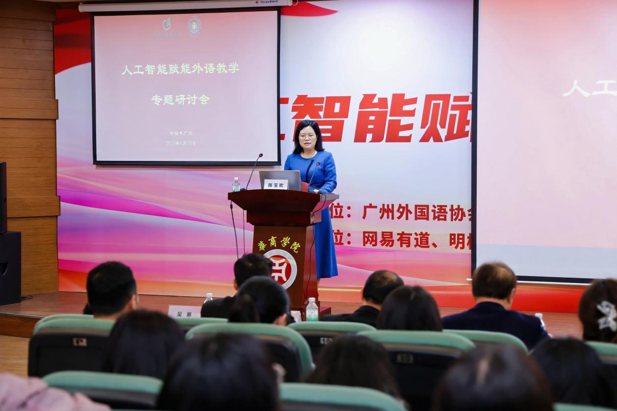 研讨会第二项议程由广州商学院校长马蔚兰教授发言。她指出人工智能正以前所未有的速度重塑教育生态,pp电子官方网站入口秉持着“技术赋能教育,创新驱动发展”的理念,用智能技术为个性化学习开辟新径、为跨文化能力培养注入动能,同时打造了智慧语言实验室、开发智能评估系统、与多家科技企业共建产教融合平台等AI+教育实践,致力于以产教融合为抓手培养应用型外语人才。最后她预祝研讨会圆满成功并相信本次研讨会一定能够为人工智能时代外语教育的高质量发展产生重要的推动作用。